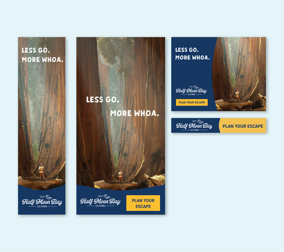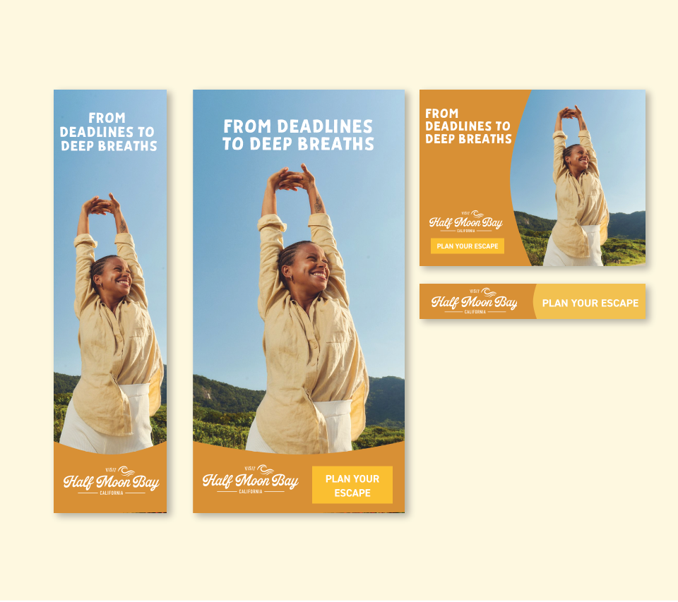 The campaign centered around the idea of a “coastal reset,” positioning Half Moon Bay as a place where visitors can escape the pace of everyday life and rediscover calm. Visuals expanded beyond coastline imagery to highlight downtown, farms, the harbor and local experiences, creating a more authentic portrait of the destination. Paired with simple, evocative headlines like “Less go. More whoa.” and “From deadlines to deep breaths,” the campaign reframed Half Moon Bay as an accessible micro-escape for Bay Area travelers.